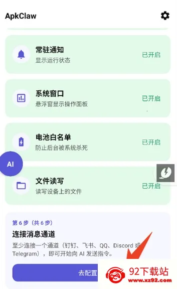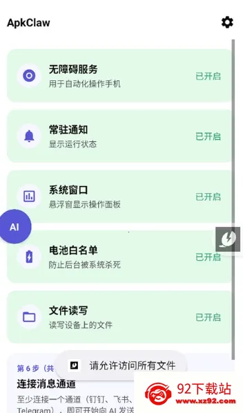 1、打开ApkClaw后首先将所有的权限打开,以便它能够正常运行工作