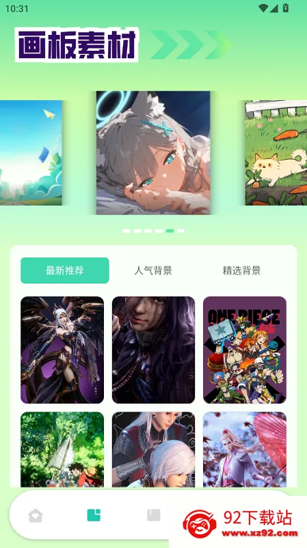 2.在下方第二个图标,为画板素材页面,里头有着最新推荐、人气背景和精选背景等功能。