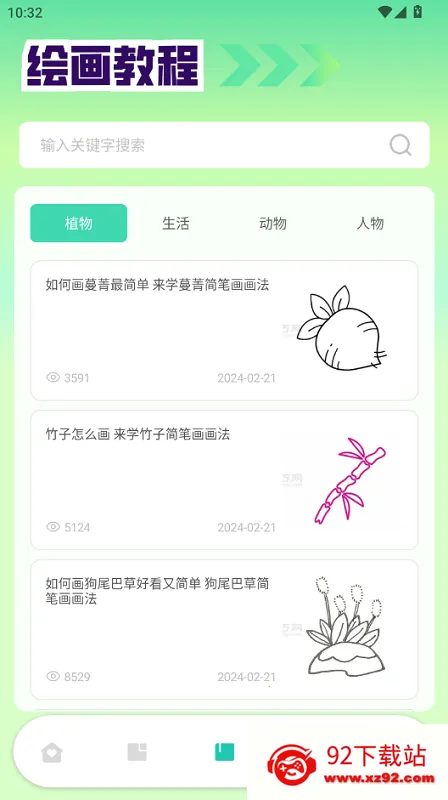 3.在绘画教程页面(下方第三个图标)中有植物、生活、动物和人物等版块,还可以输入关键字进行搜索。