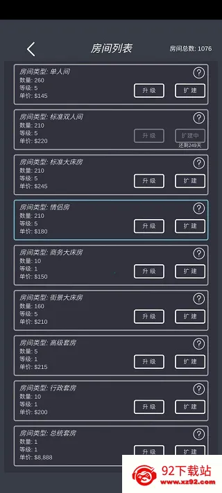 说说我的玩法,初期别开套房、高级大床、行政套房、总统套房,我三星了这些也住不满,然后走量的单人、标间、情侣、大床、街景等切记别升级太高,升级高了房价提升影响入住率,钱多了就慢慢扩张那些走量的房型。
