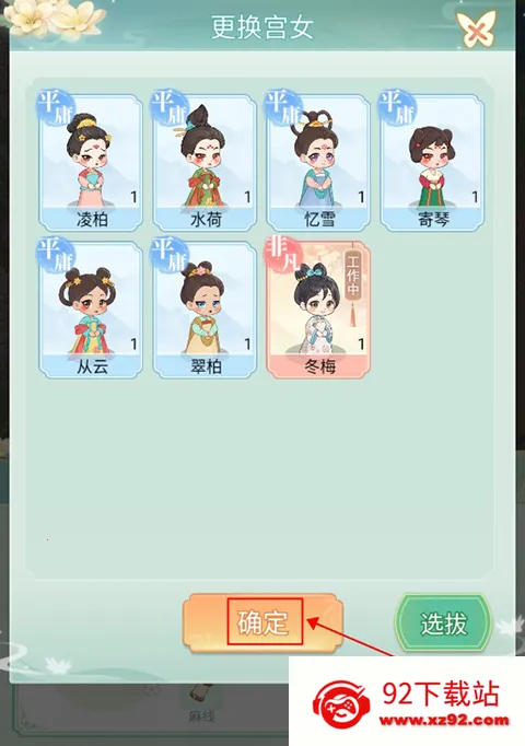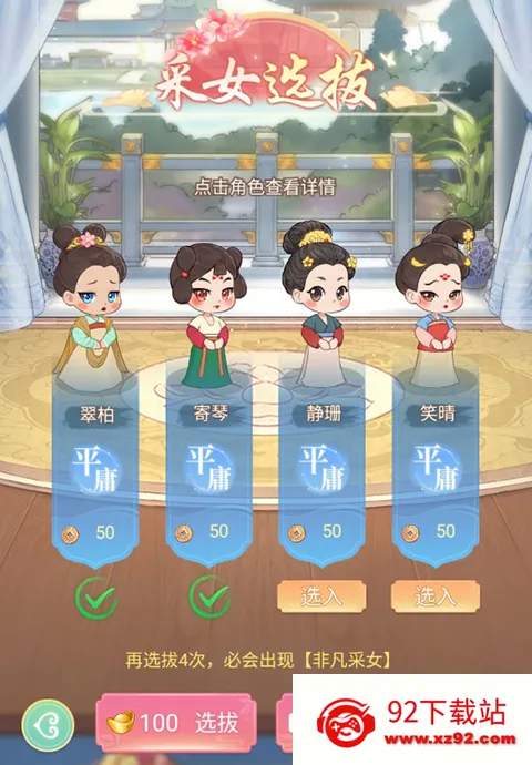 1、玩家点击右下角的选拔即可进行采女的选拔,选择合适的采女加入宫中进行工作。