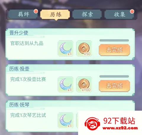 历练成就目前只有官职、投壶、抚琴三个成就任务,完成就可领取成就奖励。