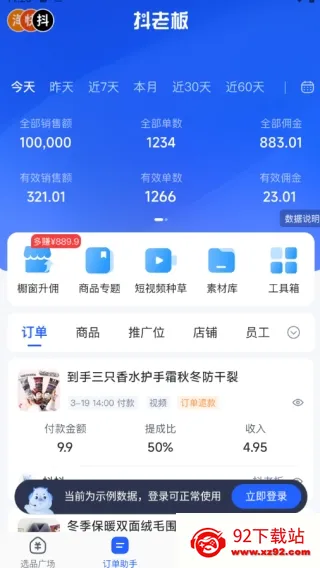 2、软件订单页面可查看当天的数据,有橱窗升佣、商品专题、短视频种草等功能。