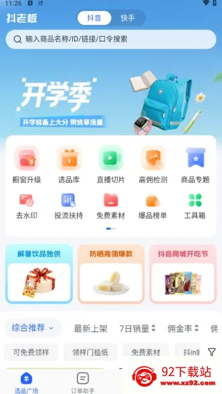 3、软件首页可以看到橱窗升级、选品库、直播切片、高佣检测、商品专题等功能。