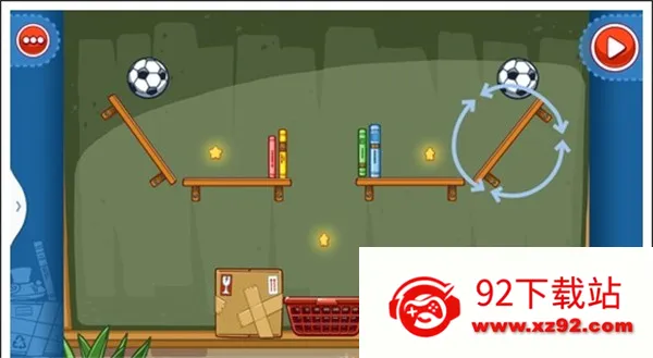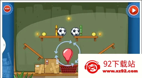 我们只需要将两个木板凳放在斜放在两侧,气球放在足球下面,这样使气球飞上去,碰到足球这样就能获得星星。