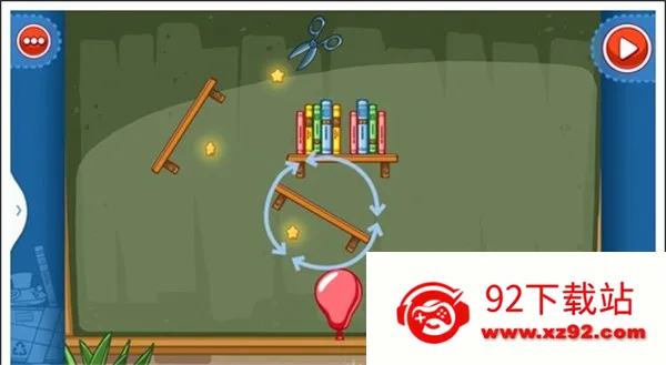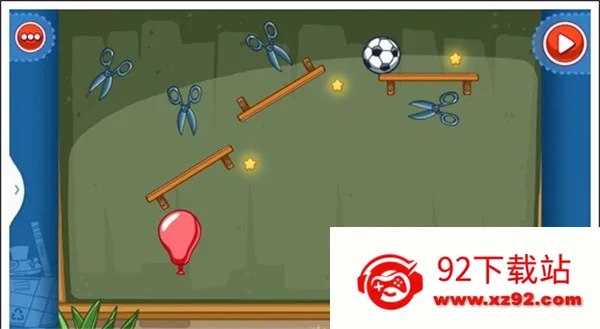 我们只需要将三个木板凳放在剪刀下面,否则气球会碰到剪刀和破掉,这样使气球飞上去,就能获得星星。