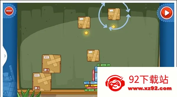 我们只需要将两个木箱分别放在2颗星星上头,一个放在绿色课本左上面,这样就可以自由落体,这样就能获得星星。