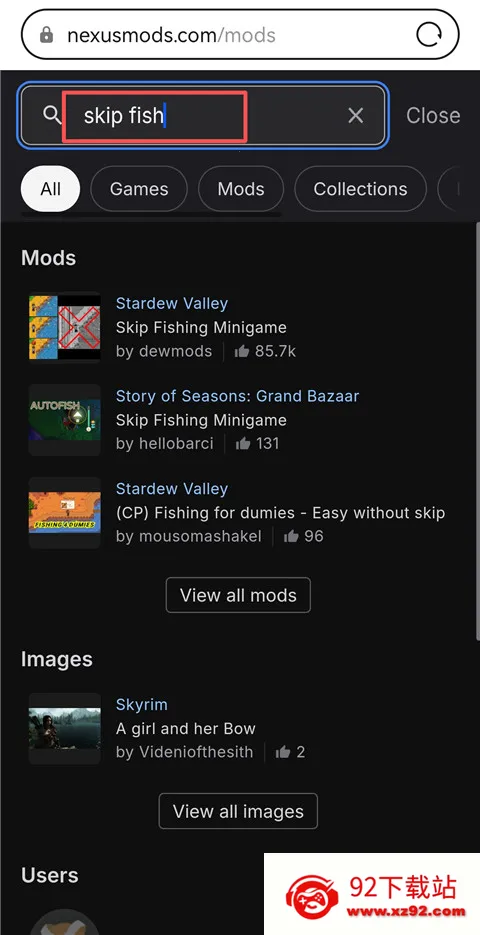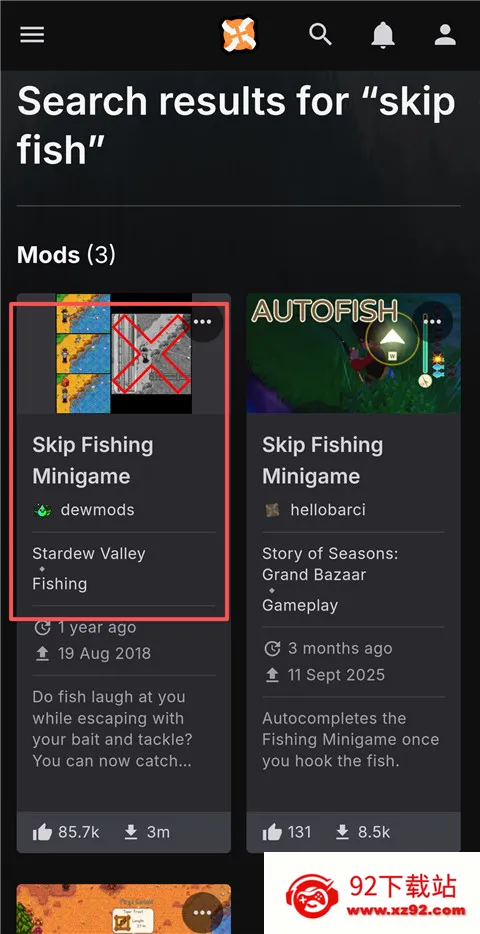 2、然后再搜索栏中搜索自己想要的mod下载,以钓鱼mod为例,搜索skip fish。