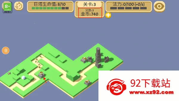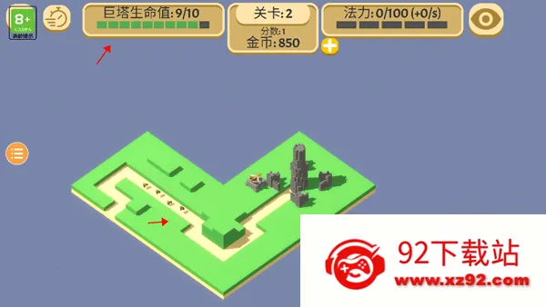 4、当有敌人攻进去宝塔时,上方的巨塔生命值就会开始减少,你要做的就是通过已有的金币在巨塔附近设置防御武器,去攻击那些侵略我们巨塔的敌人。