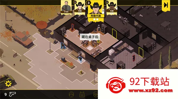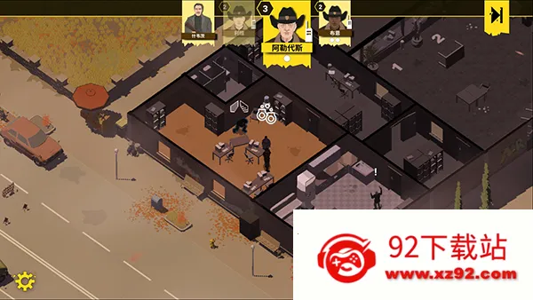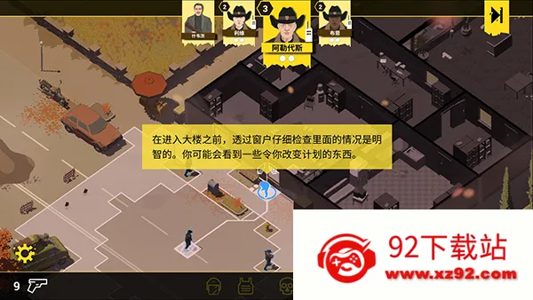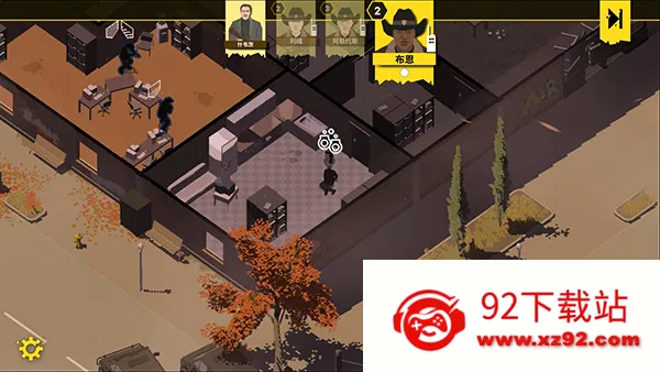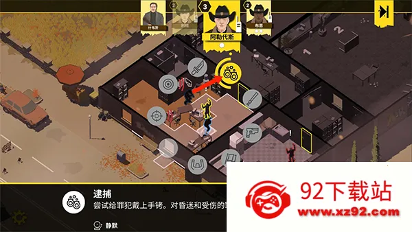 4、如图,提示接近银行大楼,点击图中标记的方块,一个警察通常每回合可执行两个动作,短距离移动会用掉一个动作,需要合理安排规划,