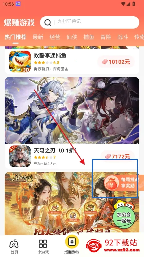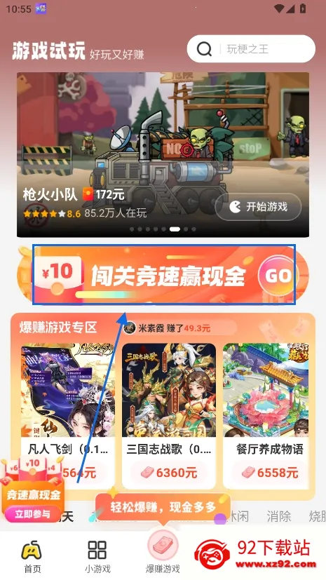 1、首页,点击闯关赢奖励板块就进入,可以挑战游戏内容获得红包奖励