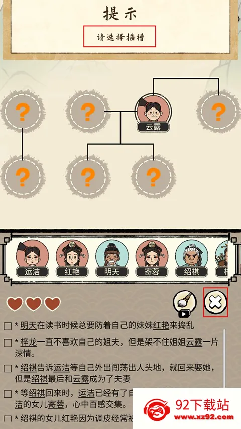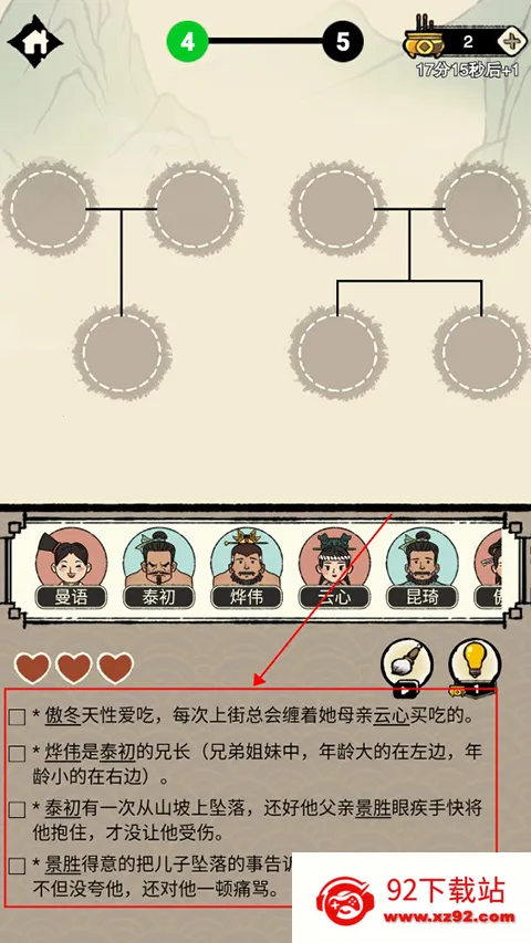 2、进入关卡后,玩家需要根据下方文字提示,将人物头像拖入上方合适圆框内,进行族谱的修缮。