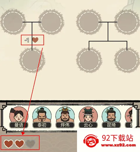 3、如果拖入的人物与圆框不不对应,会扣除血量,三格血量全部扣除即为失败,因此玩家需要小心判断。