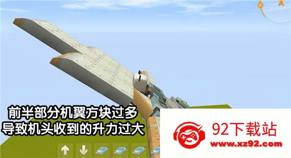 平衡飞行关键二:升力调控。机翼方块在高速移动时产生升力,前部过量将导致剧烈抬头。若出现抬头失控,优先削减前段机翼,或在后段补装机翼平衡升力分布。