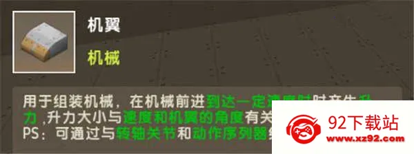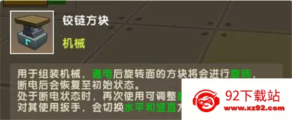 铰链方块:核心转向部件,仅在通电状态下生效。安装后,旋转面所附着的方块将随指令同步转动;用扳手点击可切换左右旋转方向,是机翼摆动与尾翼偏转的关键执行单元。