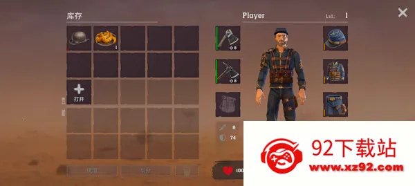 5、点击右下角背包,你可以给角色装备武器、食用食物,以保证角色的健康;